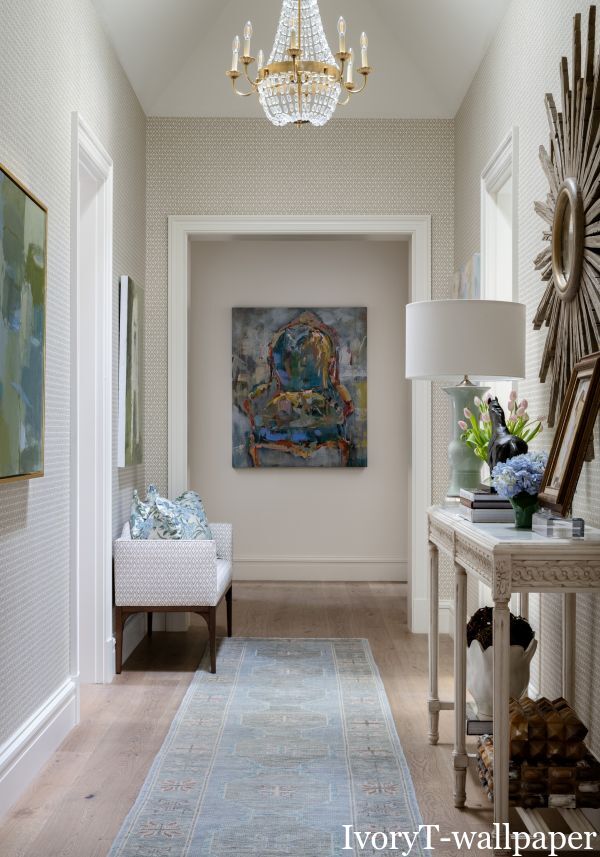 * It is advisable to avoid bold, large-scale patterns in narrow hallways, as highly detailed florals, damasks, or geometric designs may create a sense of chaos and limit visual space. Opting for neutral tones can effectively balance these design choices and contribute to a more open and refined atmosphere.