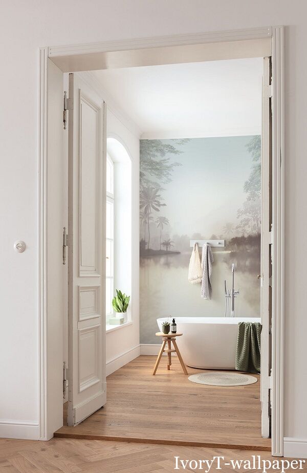 Lac Tropical Pure Mural: The lake offers a magnificent view of tropical palm trees and exotic jungle plants on its distant shores.