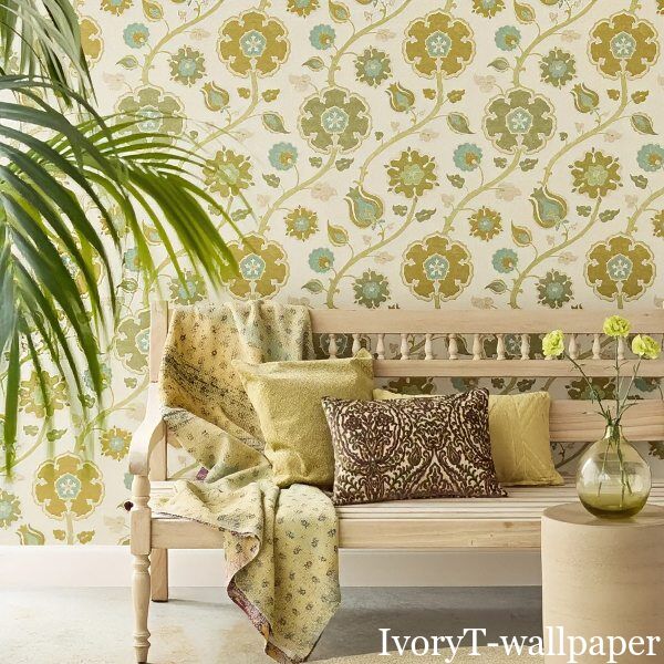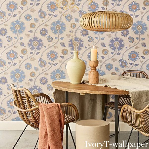 This vinyl wallpaper features a floral pattern in bold tones on a plain background. Large flowers and curved tendrils create a harmonious rhythm and give the composition a subtle oriental flavour. The look conveys the patina of old textile prints. Trailing Floral is characterised by a textured surface that is reminiscent of fabric.