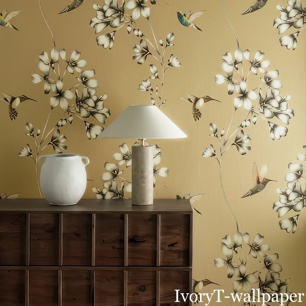 This graceful wide-width wallpaper, available in a range of colourways, features a combination of hand-drawn botanical etchings and hummingbirds.