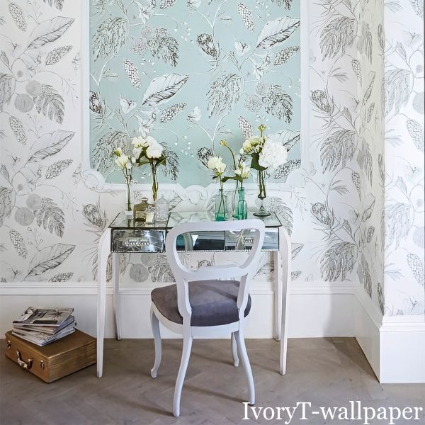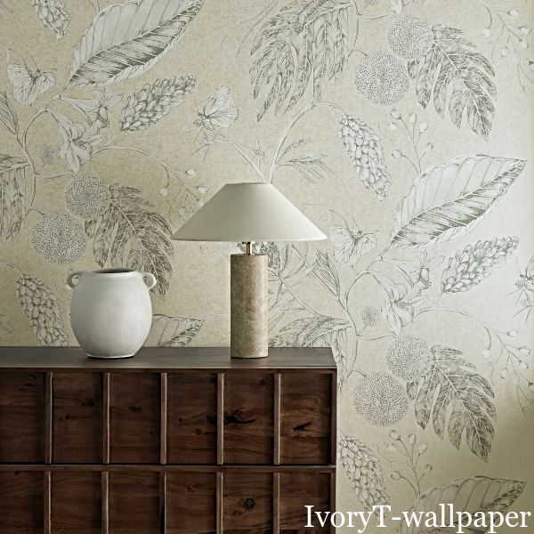 A botanical vintage wallpaper design featuring delicately drawn butterflies pinecones and exotic flowers. Printed on a metallic texture-effect background and best suited to walls that catch the light.